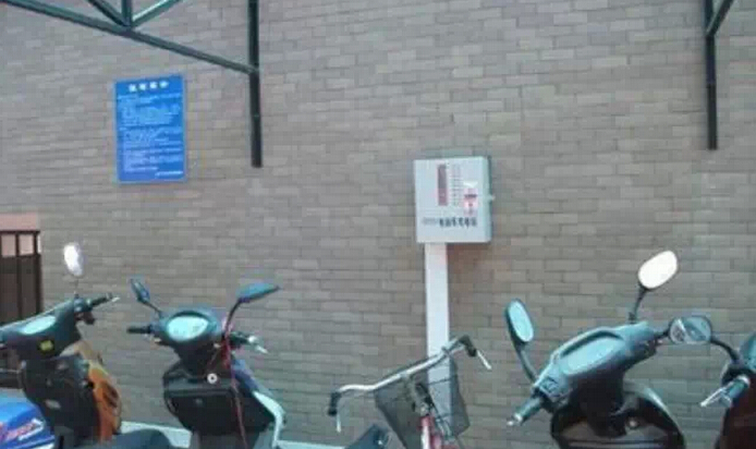 每隔4米一個(gè)電動(dòng)車充電箱,有4個(gè)插座,充滿后有人拔電源